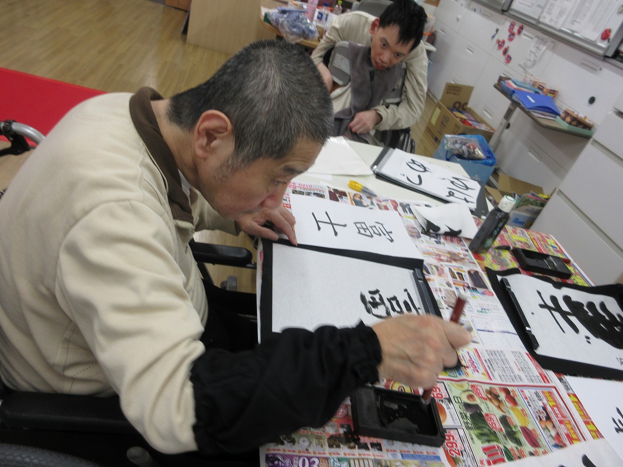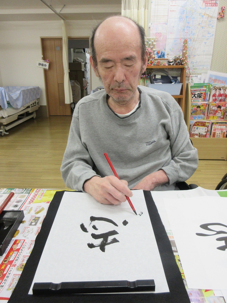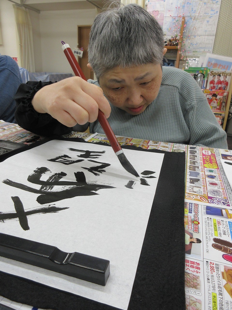新年を迎えて書き初めを行いました。皆さん、熱心に目標や抱負や縁起の良い言葉を書かれていました。