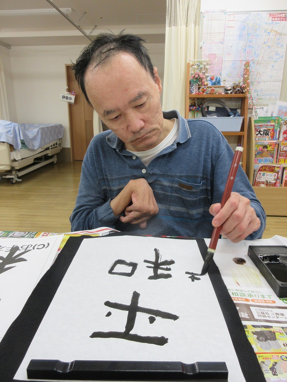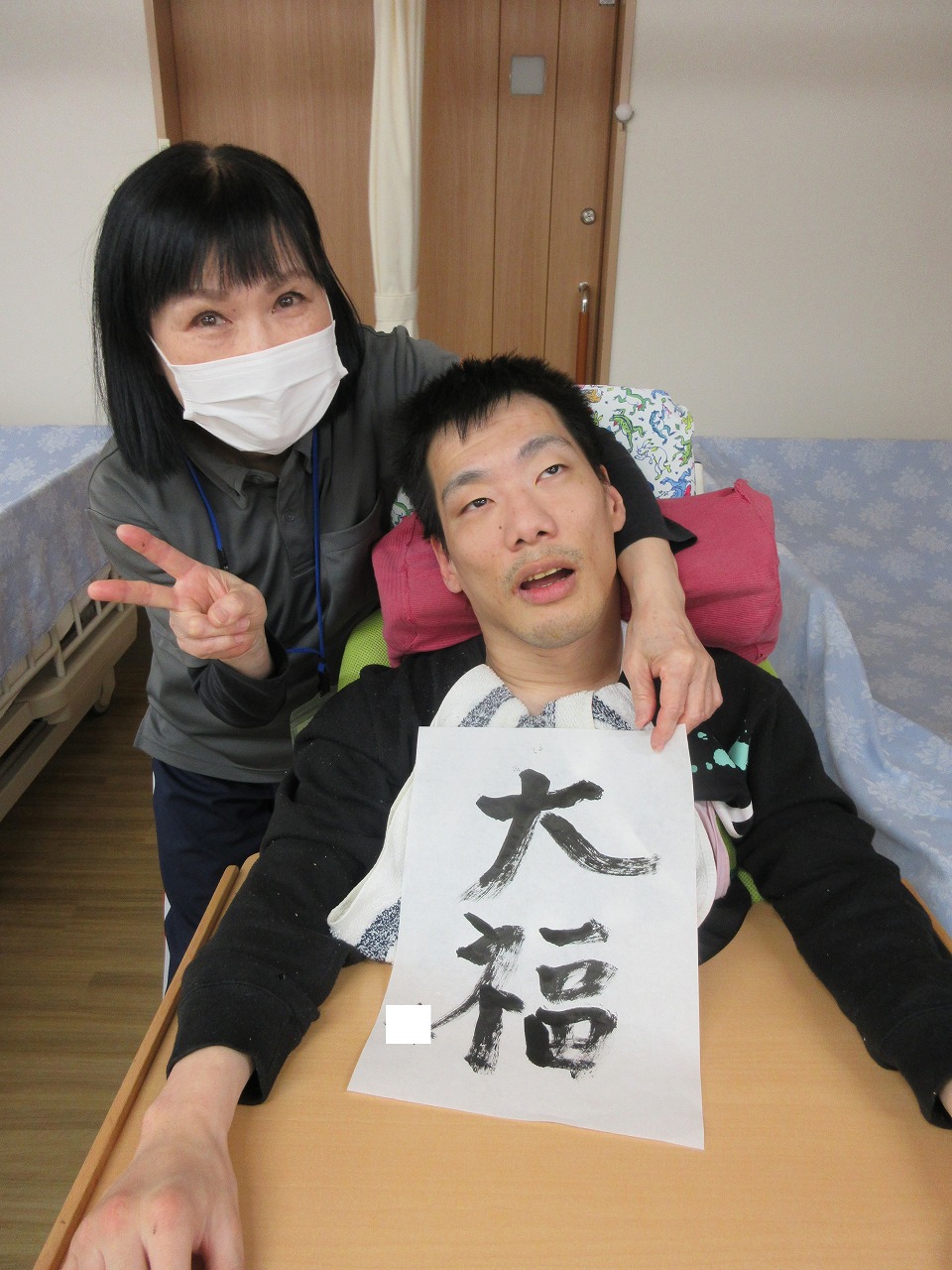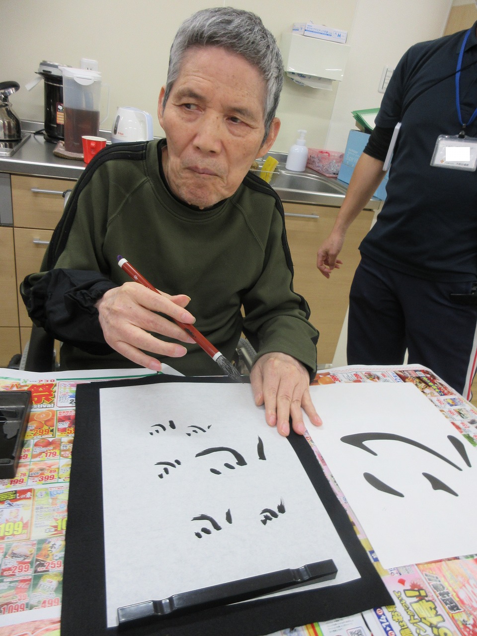 新年を迎えて書き初めを行いました。皆さん、熱心に目標や抱負や縁起の良い言葉を書かれていました。