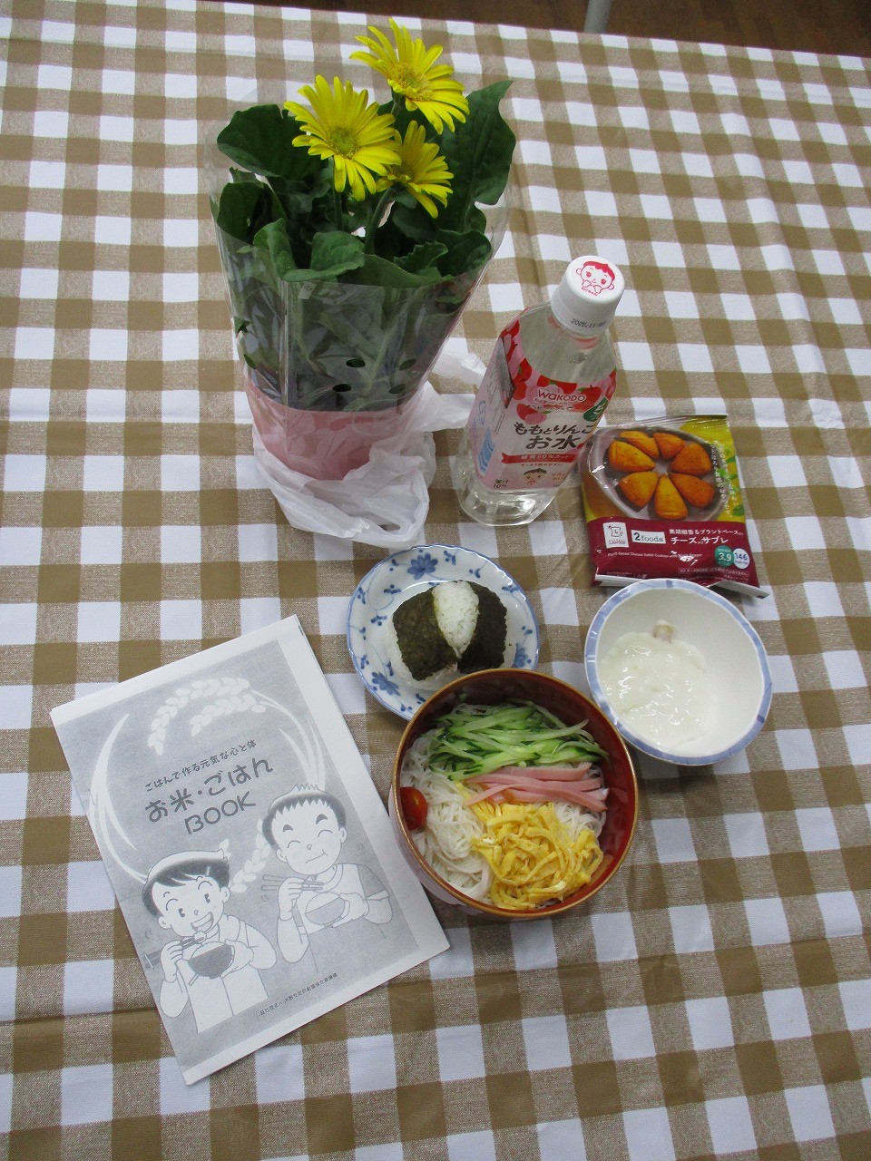 今回はそうめんと手作りおにぎりをご提供しました。デザートにフルーチェを添えて。