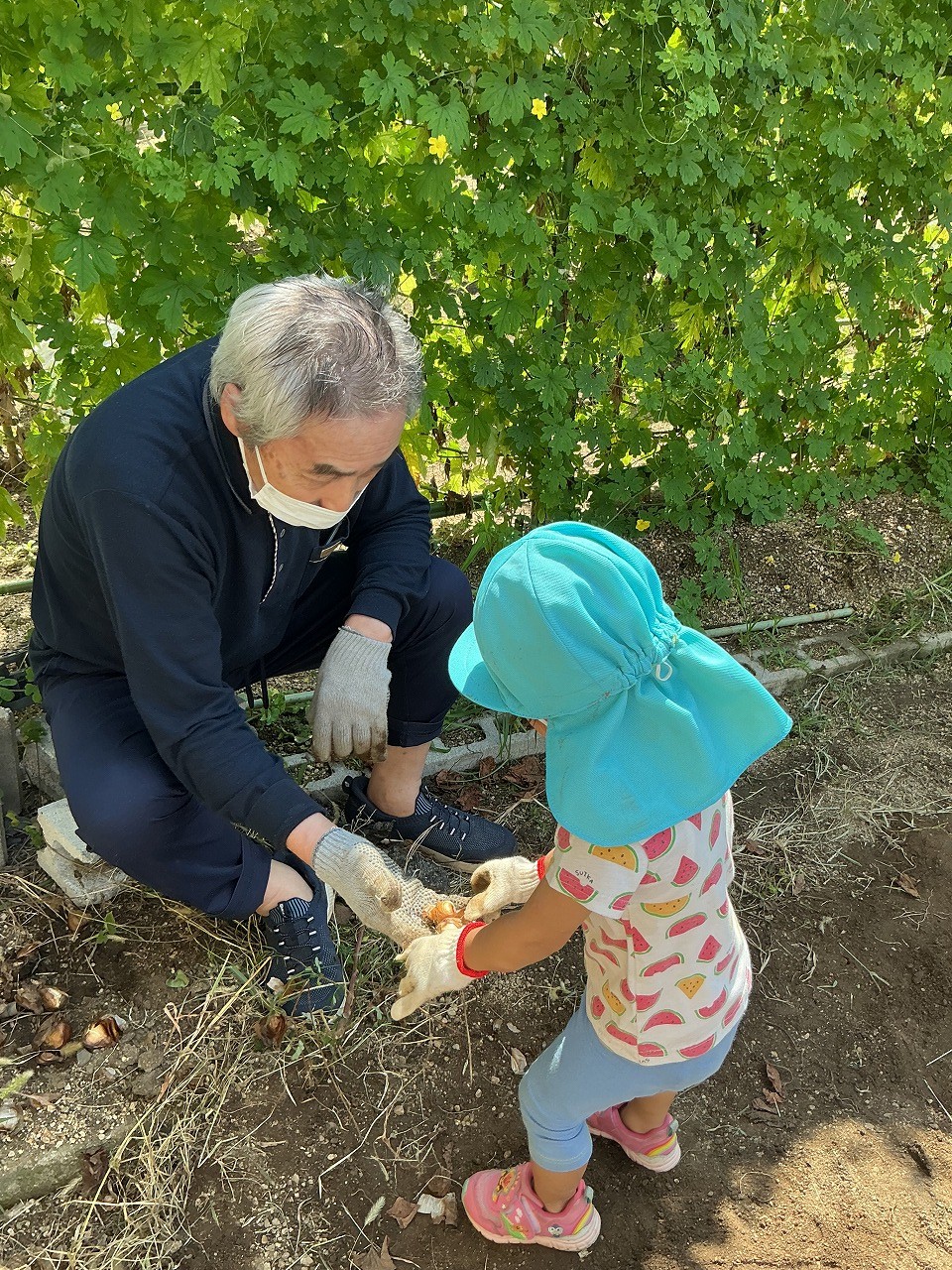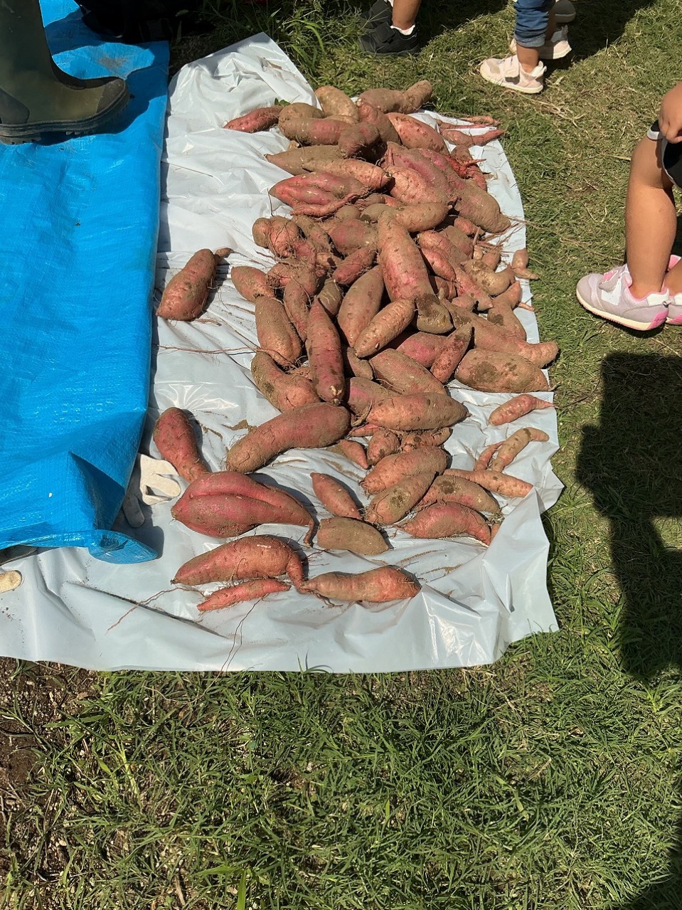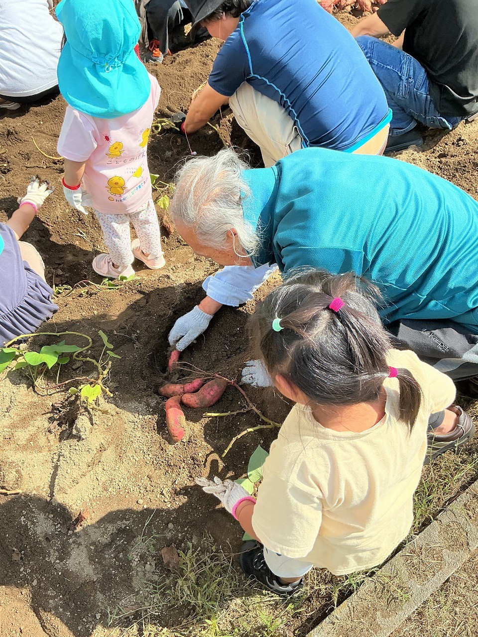 園児が「お芋さんがとれた!」と笑顔でみせてくれたことに対して施設利用者も「中々やるなあ!」と笑顔で返すなど賑やかな雰囲気のなか、大小たくさんのお芋さんが採れました。