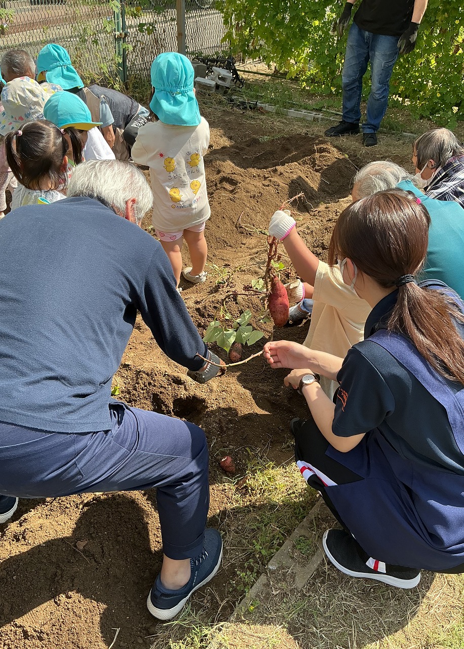 先日、近隣の保育園児をお招きし、施設近くの畑で芋掘りを行いました。
