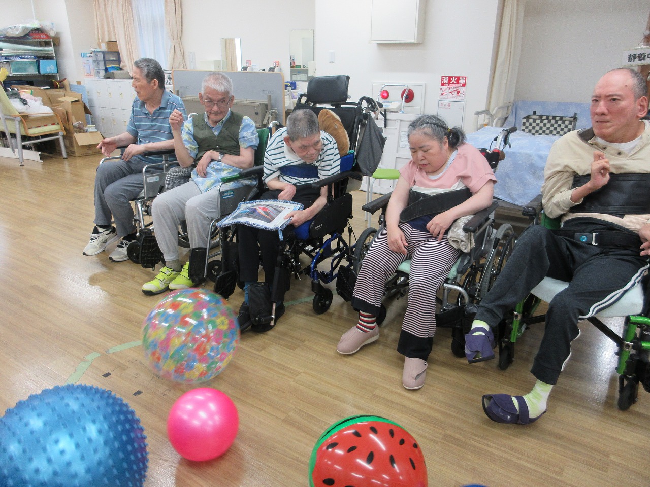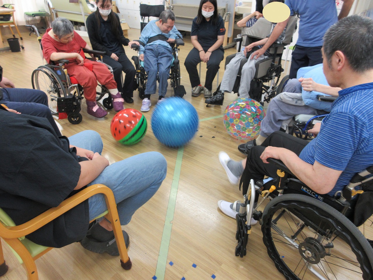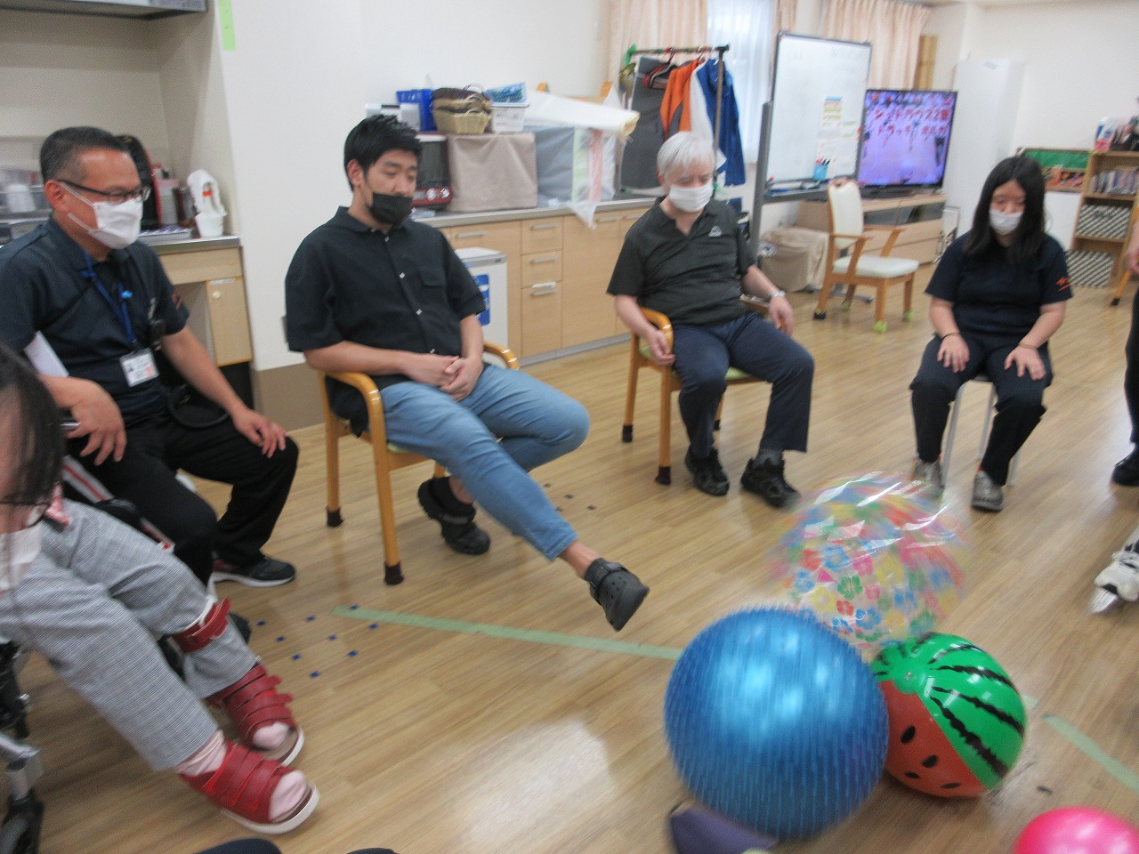 大・小さまざまな種類のボールをタイミングよく蹴ったり、空振りしたり、時には勢い余って顔に飛んで来てびっくりしたり、楽しく運動が出来ました。