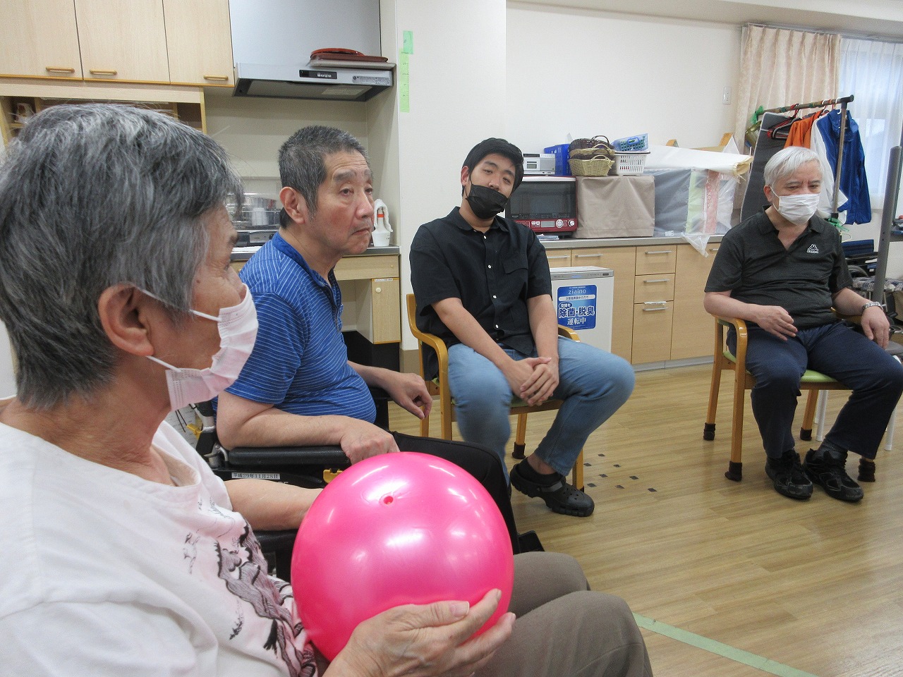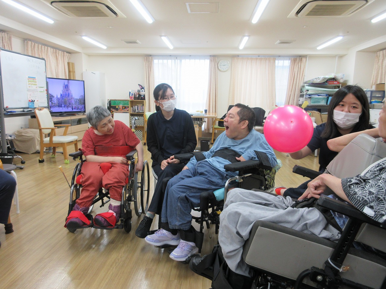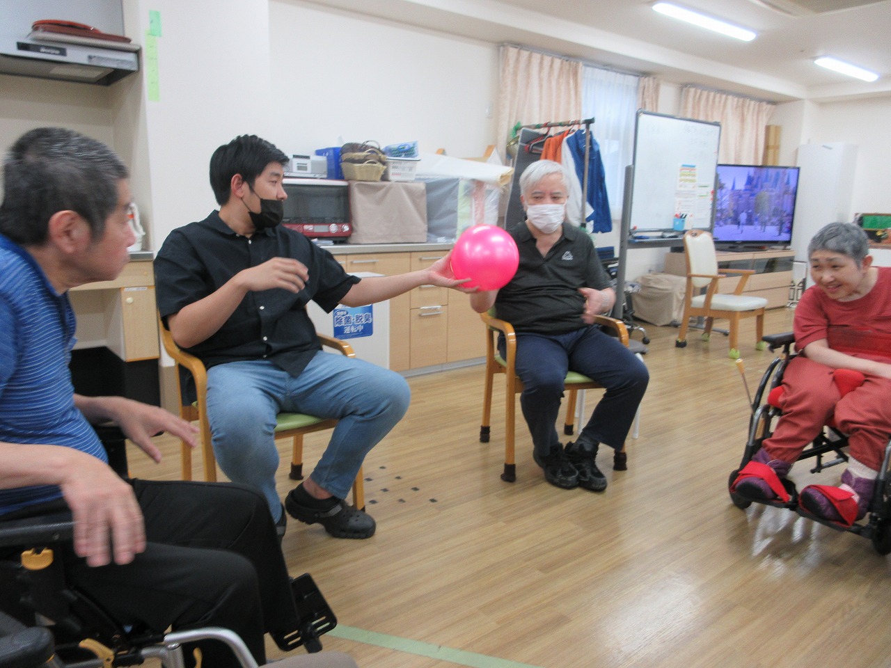 大・小さまざまな種類のボールをタイミングよく蹴ったり、空振りしたり、時には勢い余って顔に飛んで来てびっくりしたり、楽しく運動が出来ました。