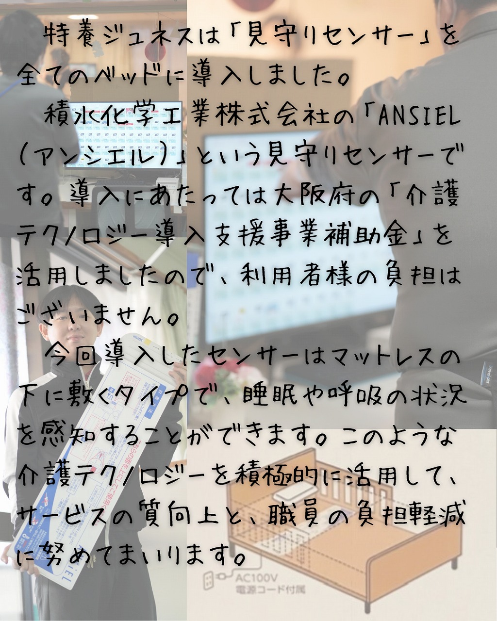 導入にあたっては大阪府の「介護テクノロジー導入支援事業補助金」を活用しましたので、利用者様の負担はございません。