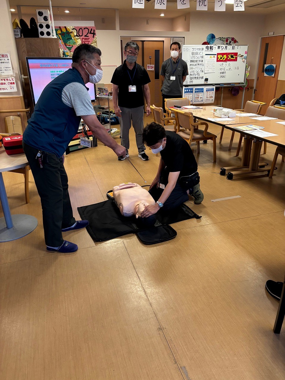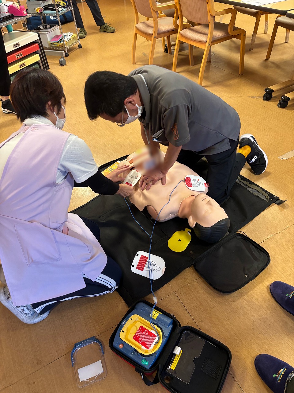 9月11日〜9月12日に今宮デイサービスセンターにて、CPR(心肺蘇生法)とAED訓練を行いました。