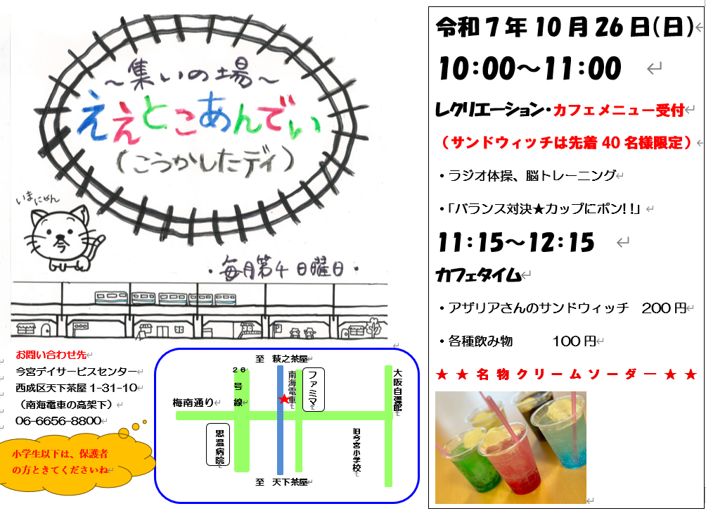 毎月第4日曜日(10:00〜12:15)に今宮デイサービスセンターで実施している、子供から高齢者まで誰でも利用できるレクリエーション+カフェの集いの場です。