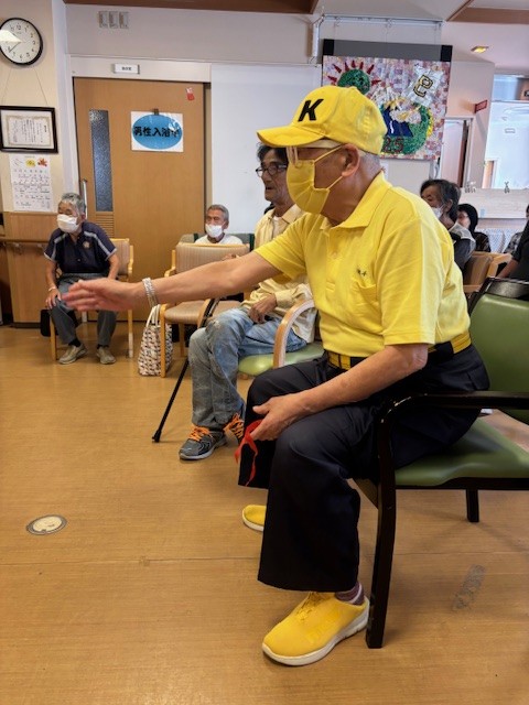 レクリエーションは「おさかなダーツ」です。イスに座りながら魚の形をしたダーツを投げ、的に当たった点数を競うゲームです。