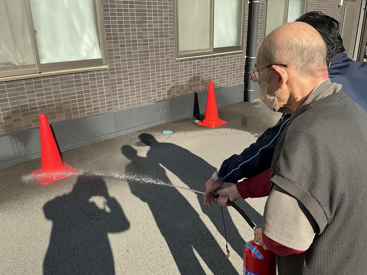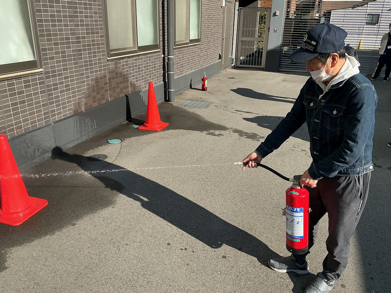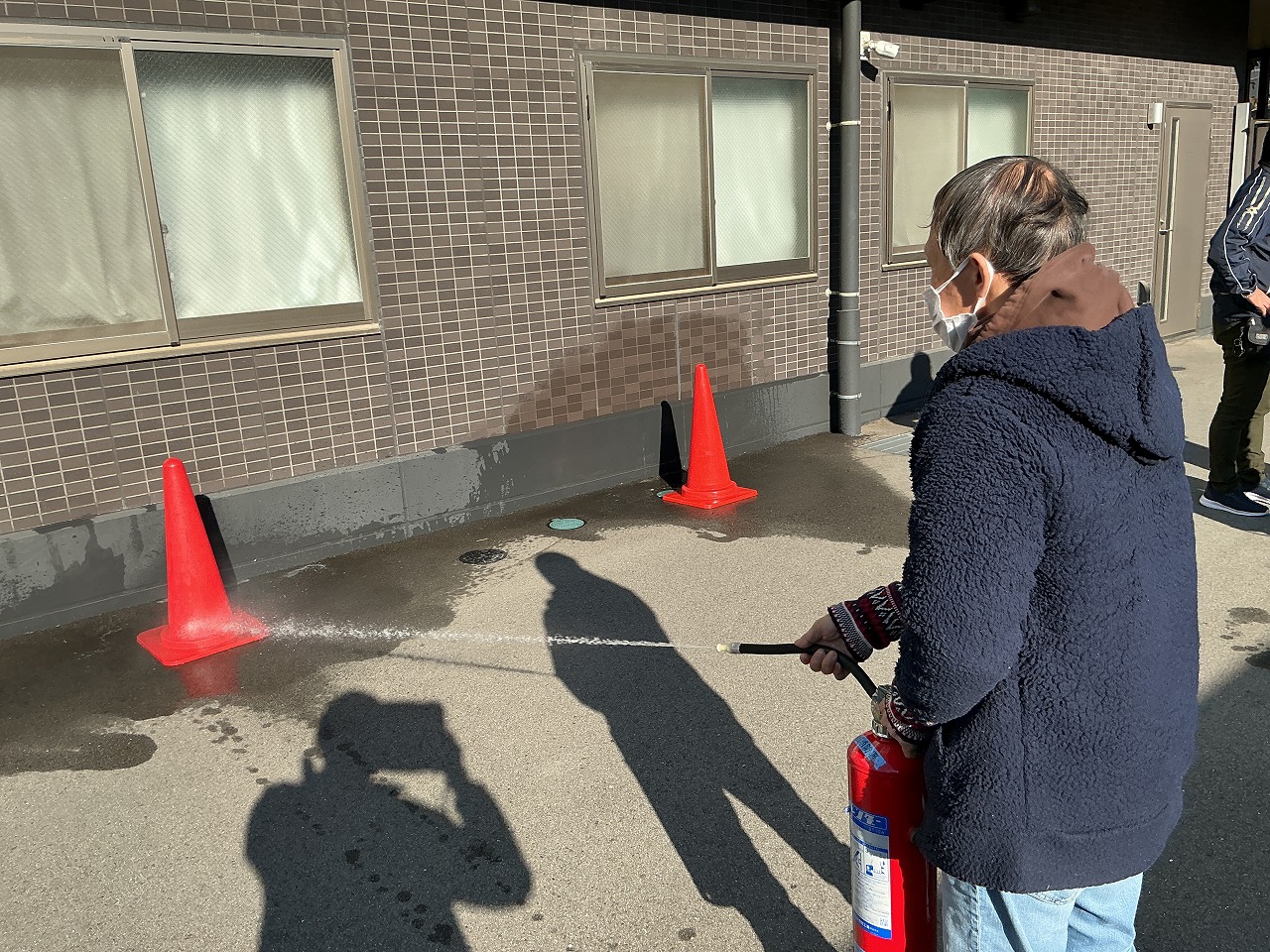 利用者向けの消火訓練を行いました。実際の消火器を用いながら、使い方や種類の説明を行った後、西成消防署からお借りした水消火器を使って消火訓練を行いました。