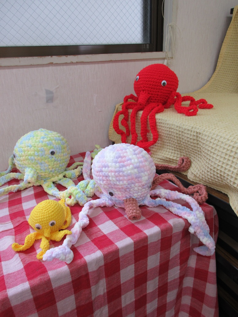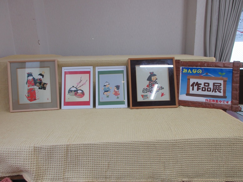 作品展示では、ひなまつりの切り絵と 毛糸で編んだ作品をお借りして展示しました!