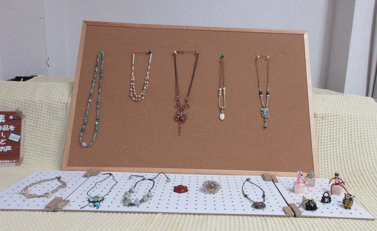 ブローチやビーズ作品、ネックレスなど多数の作品も展示させていただき、特に女性の方から大好評でした!たくさんお借りしているので、来月も展示する予定です。