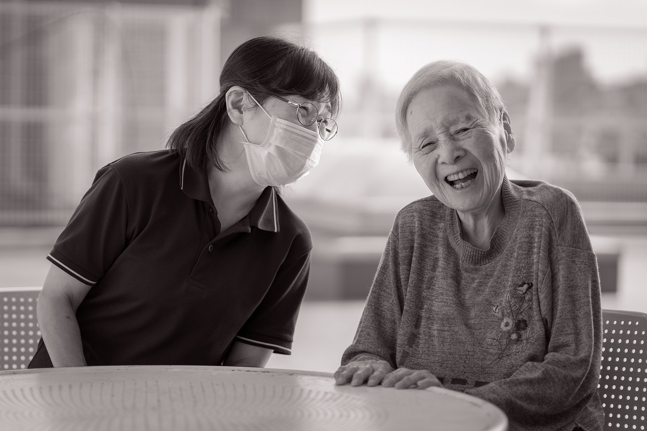 ジュネススタッフと利用者様が施設の屋上で笑い合っている瞬間が撮影されました。日々の積み重ねがお互いの表情ににじみ出るのだと思います。
